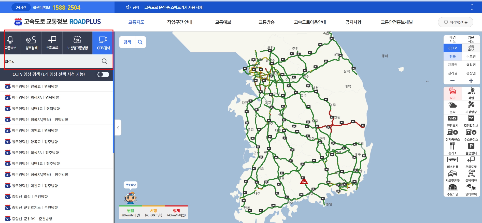 교통안전 홍보채널 --> 원활 (80km/h 이상) 서행 (40~80km/h) 정체 (40km/h 미만) 휴게소 휴게소 사고 사고 작업 작업 날씨 날씨 졸음쉼터 졸음쉼터 전면차단 전면차단 --> 홈페이지 콘텐츠 만족도(교통지