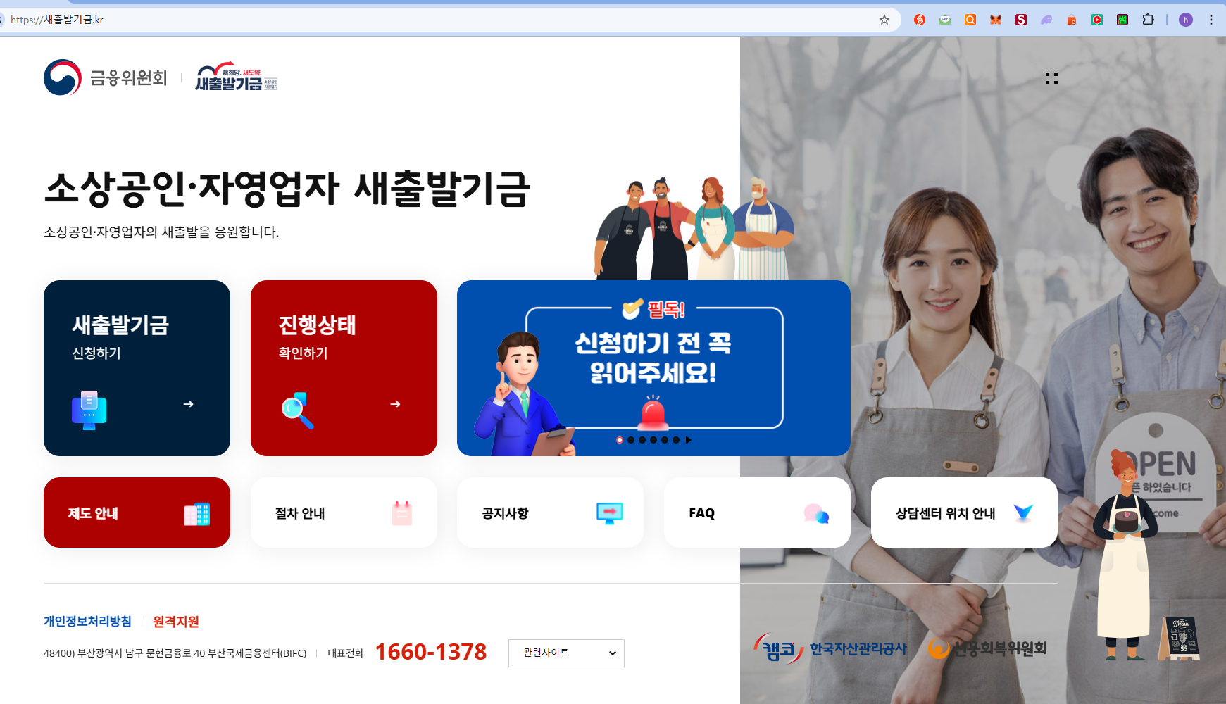 | 보이스피싱 주의 | 새출발기금은 공식 콜센터(1660-1378) 외에 전화, 문자 발송 없음 |