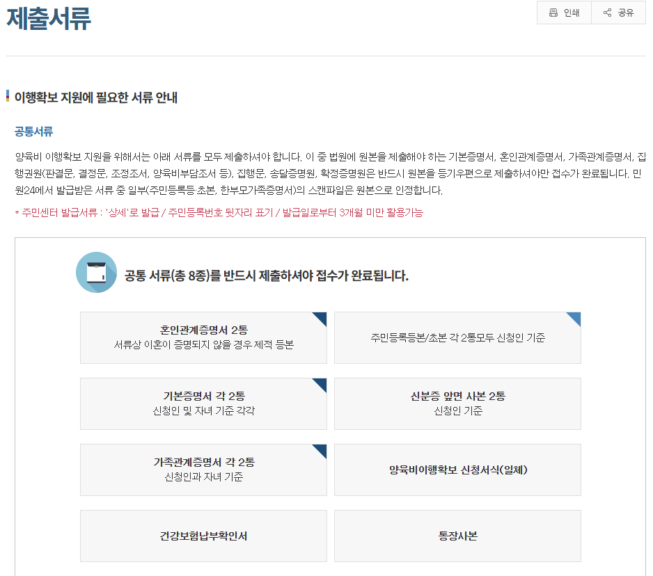 이행확보 지원에 필요한 서류 안내 공통서류 양육비 이행확보 지원을 위해서는 아래 서류를 모두 제출하셔야 합니다. 이 중 법원에 원본을 제출해야 하는 기본증명서, 혼인관계증명서, 가족관