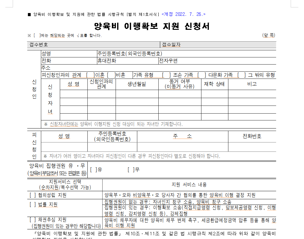 - 법률지원: 상대방 주민등록초본, 양육비 부담조서